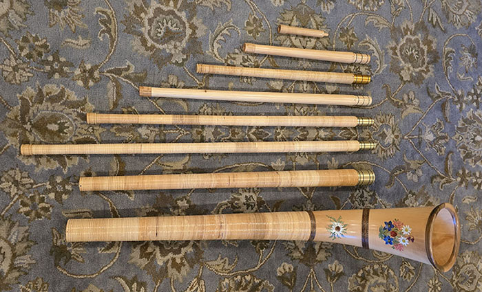 Alphorn TubesAlphorns today are generally made in 3 sections: The hand tube (closest to the mouth), the middle tube, and the bell section. They are connected together with gold-anodized aluminum couplings supplied with O-Rings to ensure an airtight connection between the tubes. When assembled, the connections between the tubes are mostly hidden, so they appear to be made of a single, long piece. When we play our alphorns in public, the most common question is: "How do you transport such a long instrument?!" A 12-foot long alphorn in F consists of three roughly 4-foot sections. The overall length of an alphorn —i.e. its pitch or tuning — is most easily changed by replacing the hand tube with one of a different length. Alphorn Tunings: F# and FThe two most common tunings for alphorns today are F-sharp (Fis) in Switzerland and F almost everywhere outside Switzerland. The historical reason for the F-sharp alphorn tuning in Switzerland today is not completely understood. A likely scenario is that the F-sharp tuning was not crafted with that specific tuning in mind. Before the mid-20th century, alphorns were played by individuals, not in groups. There was no need to standardize a particular tuning. There is a wide range of historical alphorn lengths. In the course of alphorn development, a particular template was used by several alphorn makers. Now that alphorns of the same length were available, polyphonic alphorn playing became possible. For detailed information about historical alphorn lengths, see: Other Alphorn Tunings:Alphorns in A-FlatDuring my research on the central Switzerland mutli-instrumentalist and alphorn player/composer Johann Aregger, I learned during the 1970s and 1980s in Engelberg and the Canton of Obwalden, the standard alphorn tuning was A-flat (shorter than F and Fis alphorns). The general Swiss standard of F# tuning emerged about this time as well.